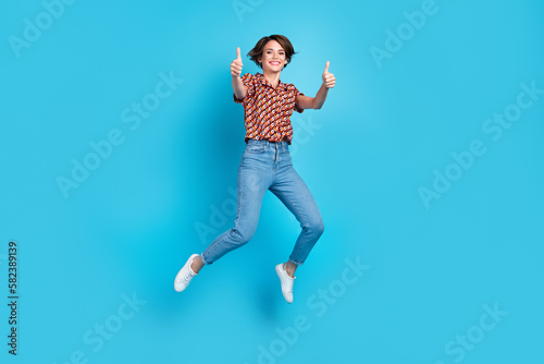 © deagreez, Fototapeta premium Full body portrait of carefree cheerful lady jumping demonstrate thumb up isolated on blue color background