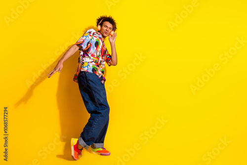 Fototapeta premium Full body portrait of nice funky young man headphones empty space wear shirt isolated on vibrant yellow color background