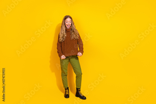 © deagreez, Fototapeta premium Full body portrait of nice young girl show sweater empty space isolated on yellow color background