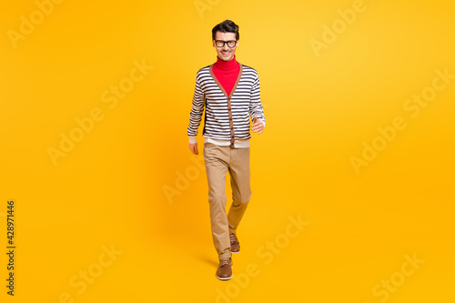© deagreez, Fototapeta premium Full body portrait of satisfied young man walking toothy smile look camera isolated on vibrant yellow color background
