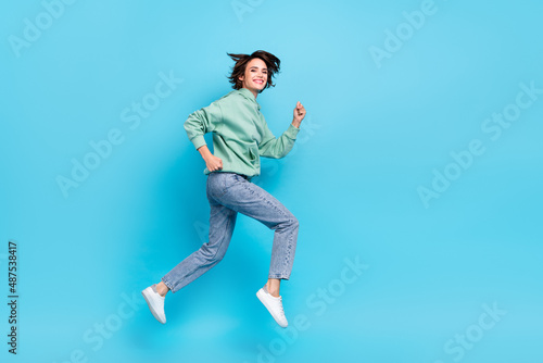 © deagreez, Obraz premium Full body profile photo of cool young brunette lady run wear pullover jeans shoes isolated on blue background