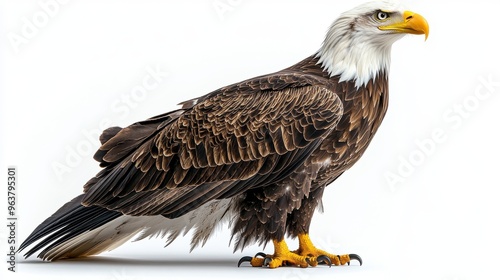 Obraz premium Full-body shot of a bald eagle on a smooth white background, emphasizing its...
