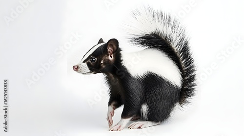 Fototapeta premium Full-Body Shot of a Skunk with Fluffy Tail Looking Over Its Shoulder on White...