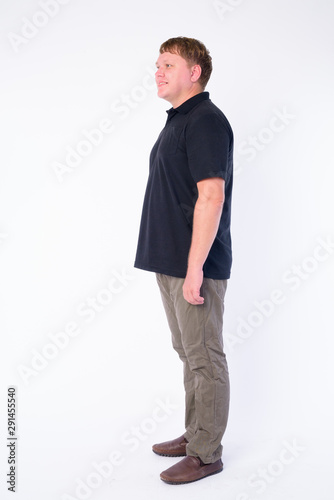 © Ranta Images, Fototapeta premium Full body shot profile view of happy overweight man smiling