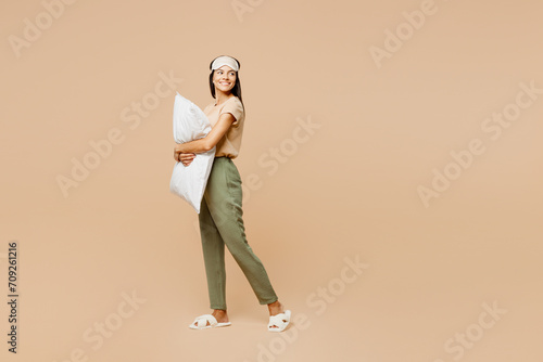 Fototapeta premium Full body side view young calm Latin woman she wears pyjamas jam sleep eye mask rest relax at home hold pillow look aside on area isolated on plain pastel beige background Good mood night nap concept