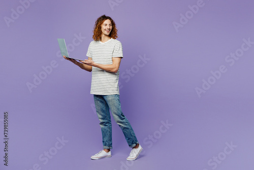 © ViDi Studio, Fototapeta premium Full body smart fun young IT man he wears grey striped t-shirt casual clothes hold use work on laptop pc computer isolated on plain pastel light purple background studio portrait. Lifestyle concept.