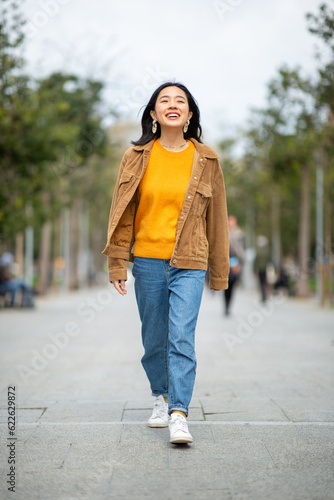 © mimagephotos, Fototapeta premium Full body smiling young asian woman walking
