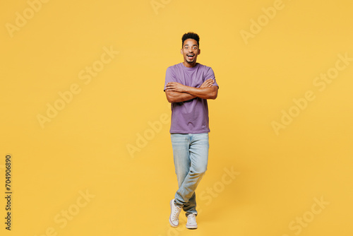 © ViDi Studio, Fototapeta premium Full body young man of African American ethnicity he wears purple t-shirt casual clothes hold hands crossed folded look camera isolated on plain yellow background studio portrait. Lifestyle concept.