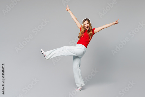 © ViDi Studio, Obraz premium Full body young smiling fun happy woman she wear red t-shirt casual clothes listen to music in headphones raise up hands leg dance isolated on plain grey background studio portrait. Lifestyle concept.