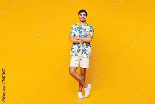 © ViDi Studio, Fototapeta premium Full body young smiling happy Caucasian man wear blue beach t-shirt casual clothes hold hands crossed folded look camera isolated on plain yellow orange background studio portrait. Lifestyle concept.