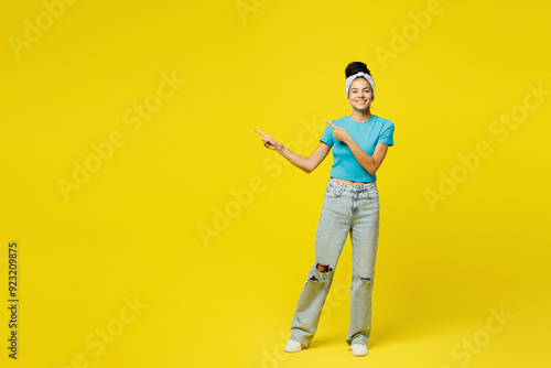 © ViDi Studio, Fototapeta premium Full body young smiling happy fun Latin woman she wears blue top t-shirt headband casual clothes point index finger aside on area mock up isolated on plain yellow background studio. Lifestyle concept.