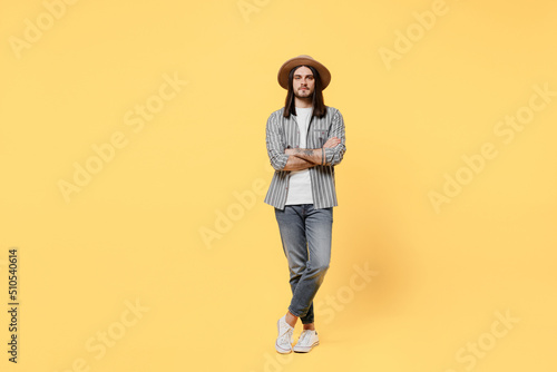 © ViDi Studio, Fototapeta premium Full body young smiling man he 20s wears striped grey shirt white t-shirt hat look camera hold hands crossed folded isolated on plain yellow color background studio portrait. People lifestyle concept.