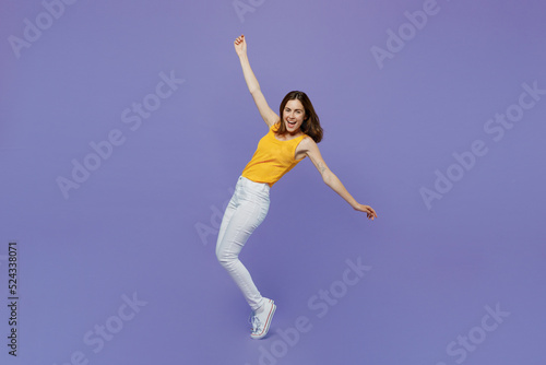 © ViDi Studio, Fototapeta premium Full body young woman 20s she in yellow tank shirt stand on toes with outstretched hands leaning back dance isolated on plain pastel light purple background studio portrait. People lifestyle concept