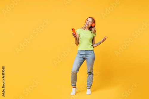 © ViDi Studio, Fototapeta premium Full body young woman she wear green t-shirt casual clothes listen to music in headphones hold in hand use mobile cell phone look aside isolated on plain yellow orange background. Lifestyle concept.