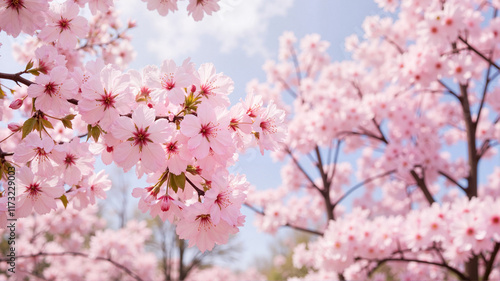 Fototapeta premium Full cherry blossom trees against a blue sky