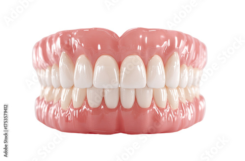 Obraz premium Full dental prosthesis, upper and lower dentures, showing even, white teeth and pink gums