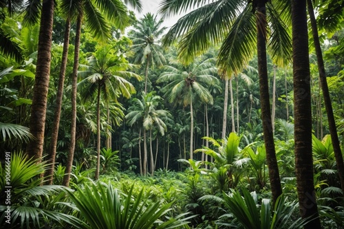 © ThomasLENNE, Fototapeta premium full framed background of dense tropical jungle with palm trees.
