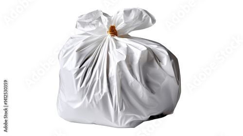 © yeewa, Obraz premium Full Garbage Bag: A close-up shot of a full white garbage bag, tied shut with a twist-tie, ready for disposal. The bag is positioned against a white background.