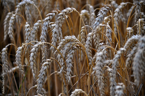 Fototapeta premium   Full grain ripe wheat ears close range in the field