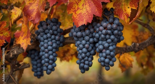 © vxnaghiyev, Fototapeta premium Full grape clusters hanging among vibrant fall foliage