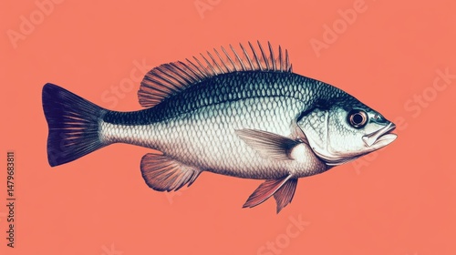© Artittaya, Obraz premium Full horizontal sea bass, centered frame, with scale and fin detail visible on orange