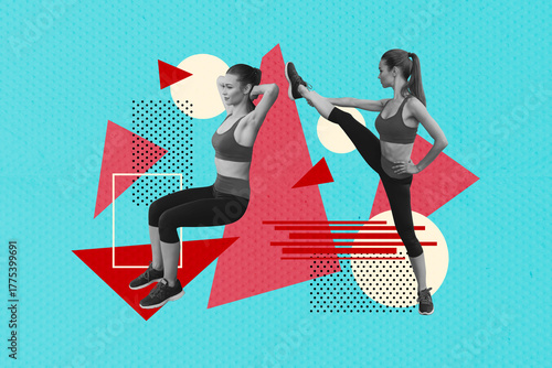 Fototapeta premium Full image 3d poster art collage of happy girl do squad yoga balance healthy lifestyle warm up pilates body-care gym trainer