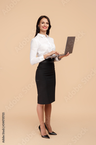 Fototapeta premium Full lengh photo of happy young modern business woman over beige background,...