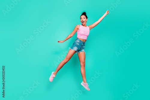 Obraz premium Full length body size photo beautiful she her jump high trendy stylish hairdo...
