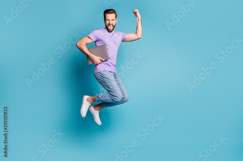 Fototapeta premium Full length body size photo of jumping freelancer with laptop gesturing like...