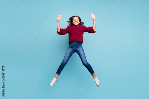 Obraz premium Full length body size photo of white cheerful preteen jumping up shaping star...