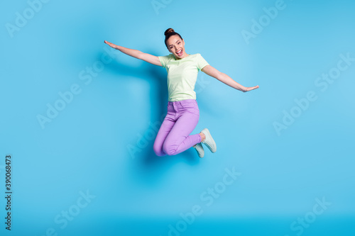 © deagreez, Fototapeta premium Full length body size photo of young girl jumping high laughing keeping hands like plane isolated on vibrant blue color background