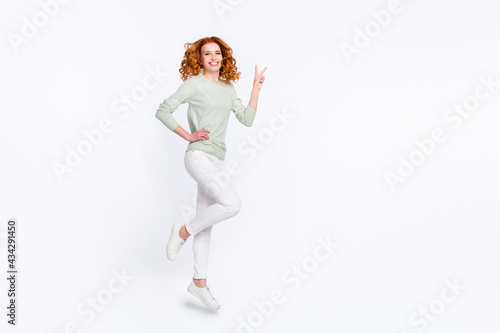 Fototapeta premium Full length body size photo young woman red hair jumping high showing v-sign isolated white color background
