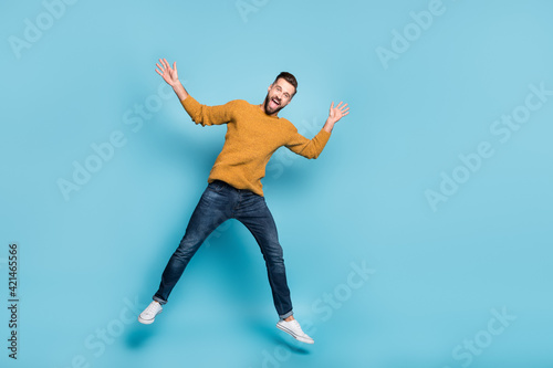 Fototapeta premium Full length body size view of attractive cheerful carefree guy jumping...