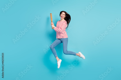 © deagreez, Fototapeta premium Full length body size view of attractive cheery girl jumping having fun fighting bat isolated over bright blue color background