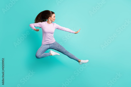 © deagreez, Fototapeta premium Full length body size view of attractive girl jumping fighting dancing having fun isolated over turquoise bright color background