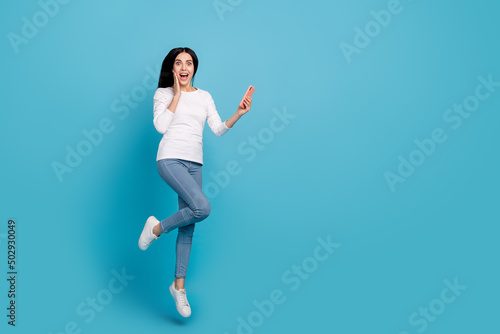 © deagreez, Fototapeta premium Full length body size view of beautiful trendy amazed girly girl jumping using gadget app isolated on bright blue color background