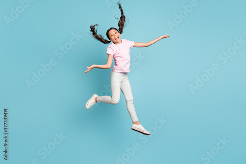© deagreez, Naklejka premium Full length body size view of her she nice attractive pretty funky childish playful comic foolish cheerful cheery girl jumping having fun fooling isolated over blue pastel color background