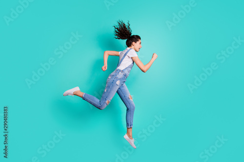 © deagreez, Obraz premium Full length body size view of her she nice attractive sportive purposeful wavy-haired girl jumping running fast marathon achievement isolated on bright vivid shine vibrant green turquoise background