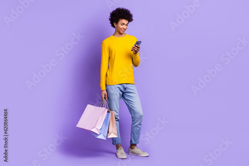 © deagreez, Fototapeta premium Full length body view cadre of young guy student shopping black friday read more propositions phone isolated on purple color background