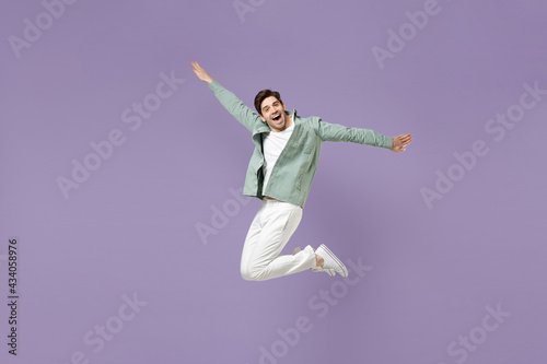 © ViDi Studio, Fototapeta premium Full length excited overjoyed energetic cool young man in casual mint shirt white t-shirt jump high with outstretched hands look camera isolated on purple violet background. People lifestyle concept