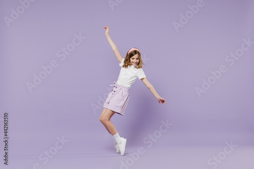 © ViDi Studio, Fototapeta premium Full length little hppy blonde kid girl 12-13 year old in white shirt stand on toes with outstretched hands leaning back dance isolated on purple color background Childhood children lifestyle concept