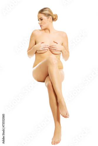 Obraz premium Full length nude woman sitting covering breast