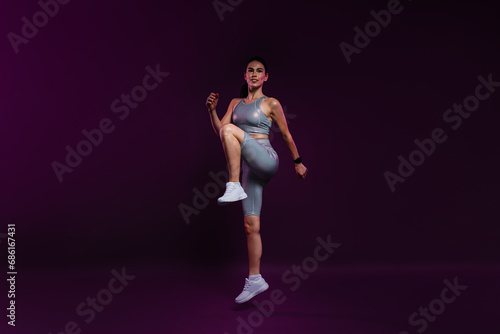 Obraz premium Full length of a slim female warming up her body against a magenta backdrop...