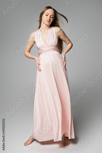 Naklejka premium Full length of barefoot long haired and pregnant woman in pink dress touching belly while standing on grey background, elegant and stylish pregnancy attire, sensuality, mother-to-be