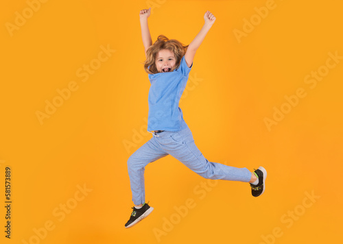 Fototapeta premium Full length of excited kid jumping. Energetic kid boy jumping and raising...