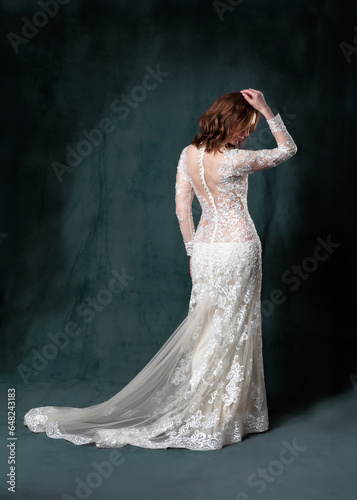 © Margarita Borodina, Fototapeta premium full length of joyful middle aged bride in white wedding dress