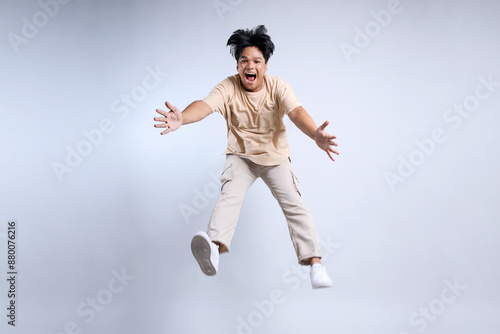 © Queenmoonlite Studio, Obraz premium Full Length Of Jumping Young Asian Man With Casual Style Isolated On White Background