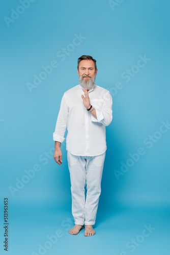 Fototapeta premium full length of master guru in white clothes showing blessing gesture on blue.
