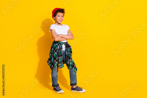 Fototapeta premium Full length photo of adorable little boy crossed hands confident dressed stylish white garment isolated on yellow color background
