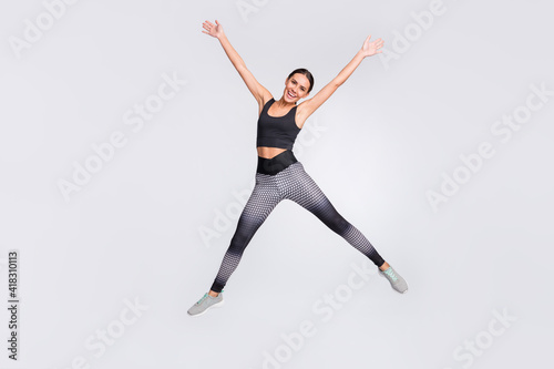 Fototapeta premium Full length photo of charming cheerful young woman jump up star shape sportive isolated on grey color background